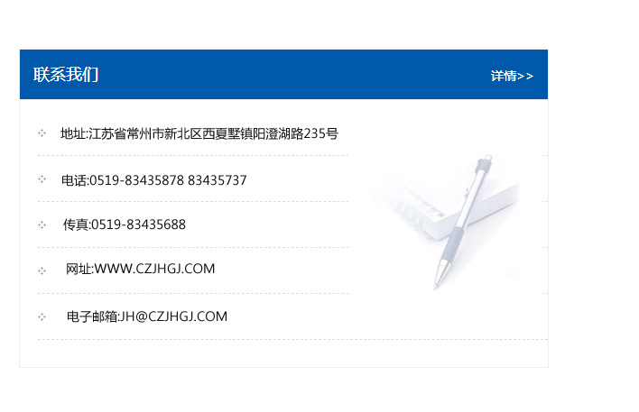 地址:常州市新北區友邦商務大廈1幢16、17層  電話:0519-85101652  傳真:0519-85112595  郵編:213022  網址:www.cz-jiayue_cn.liyuanjixie.com  郵箱:xiajifengaa@163.com